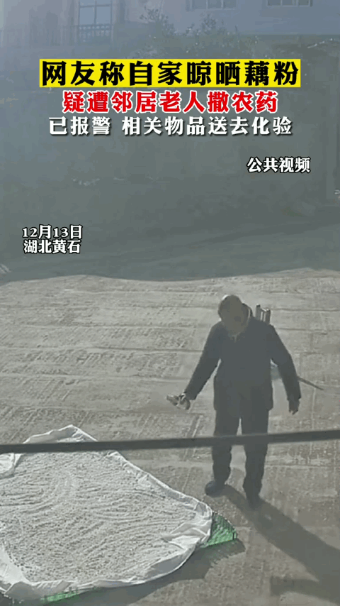 通过监控录像显示,自己邻居的一个大爷,手里拿着一瓶不明物体,走到了自家晒藕粉的地方,将手里的东西撒在了自己晾晒的藕粉上面,而且来回反复倒了好几下,看起来是有意为之,不像不小心弄撒的。