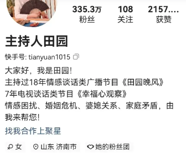 搜了一下该网红的媒体账号“主持人田园”,简介上说,她主持过18年的情感类节目,7年的电视谈话类节目,像什么情感困扰,婚姻危机、婆媳关系、家庭矛盾,都可以帮忙调解。