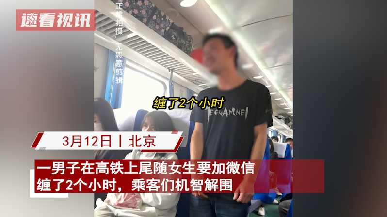 3月12日,一列正行驶在北京的火车上,有个男子一直跟在一个女生的身后,死缠烂打索要微信账号添加好友。