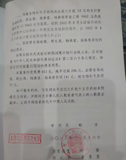 2022年底,一审判决结果下来了,责令杨老板限期内支付他们的工资。