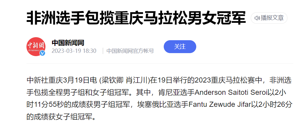 相关媒体为这次赛事发表的新闻报道,标题是:非洲选手包揽重庆马拉松男女冠军。