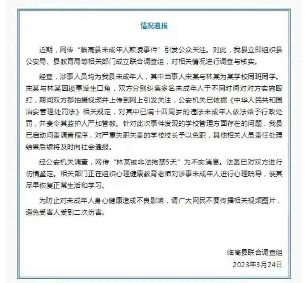 当地的官方看到事态比较严重,社会舆论压力也比较大,第一时间出面做出回应,先是把学生就读学校的校长给撤了,然后出个通告,说是互殴,各打五十大板,算是给了大家一个交代。