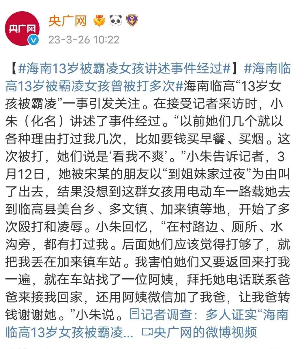 一开始是一些小地方官媒和民间自媒体大号爆料,海南一个13岁女生被一群人霸凌,被迫跪地求饶,从而引起了社会大众的关注,冲上了热点话题。