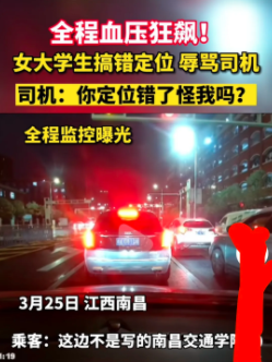 事情的经过是,这个女大学生要去南昌交通学院的西北门,但是在打车下订单的时候,将目的地定位到了东北门。一个西北,一个东北,听起来都在这个学院的北面,但是两者之间相距了七八百米,两圈体育场赛道的长度。