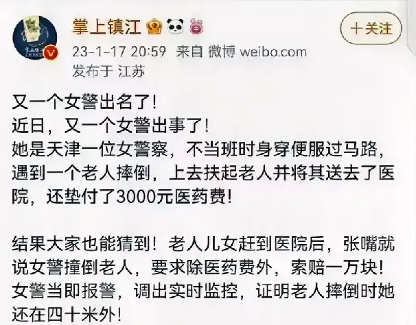 前段时间,一个女警察也遇到相似的碰瓷事件。