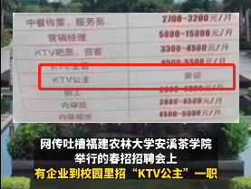 根据媒体的报道,4月4日,在福建省农林大学安溪茶学院春招现场,有一家名叫五洲佳豪酒店(安溪店)的招聘广告中,赫然写上了招聘“KTV公主”的职位,和其他招聘岗位的薪资明码标价不同,这个“KTV公主”的薪资一栏写着面议的字样。