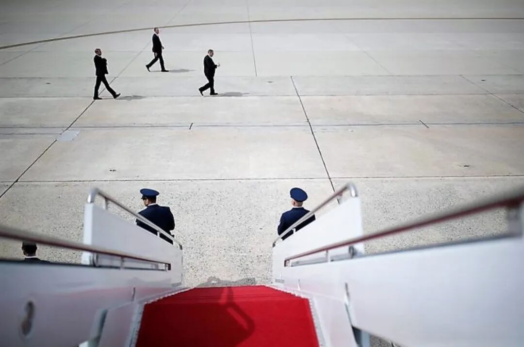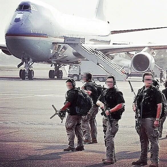 2018年6月9日,特朗普登上空军一号,从加拿大魁北克巴格特维尔的空军基地出发前往新加坡时,特勤局特工在保持戒备