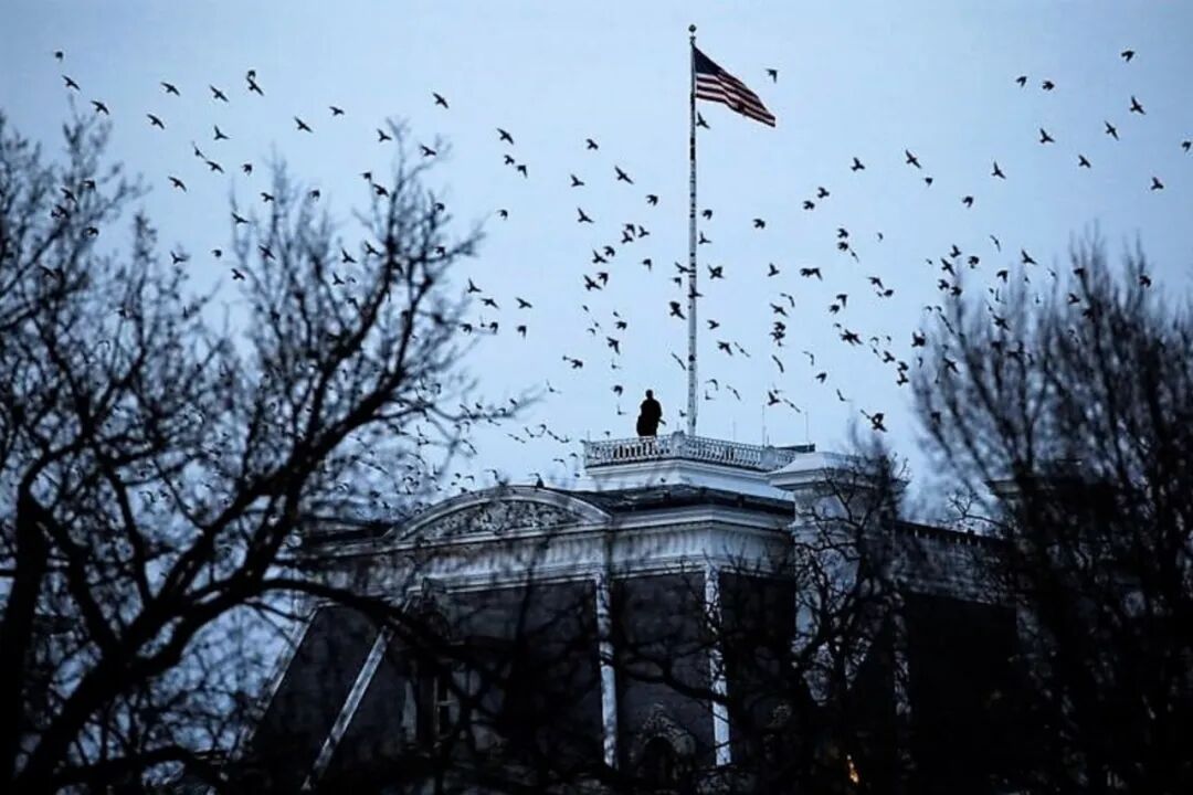 2017年11月30日,特朗普在参加白宫附近的国家圣诞树点亮仪式时,鸟儿飞过屋顶的一对特勤局狙击手