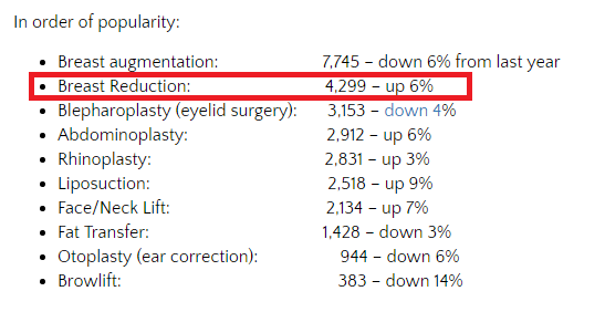 在美国男性进行的整容类手术里,男性缩胸手术一直稳居前三,到了2019年,该手术热门程度排到男性整容类手术的第一。