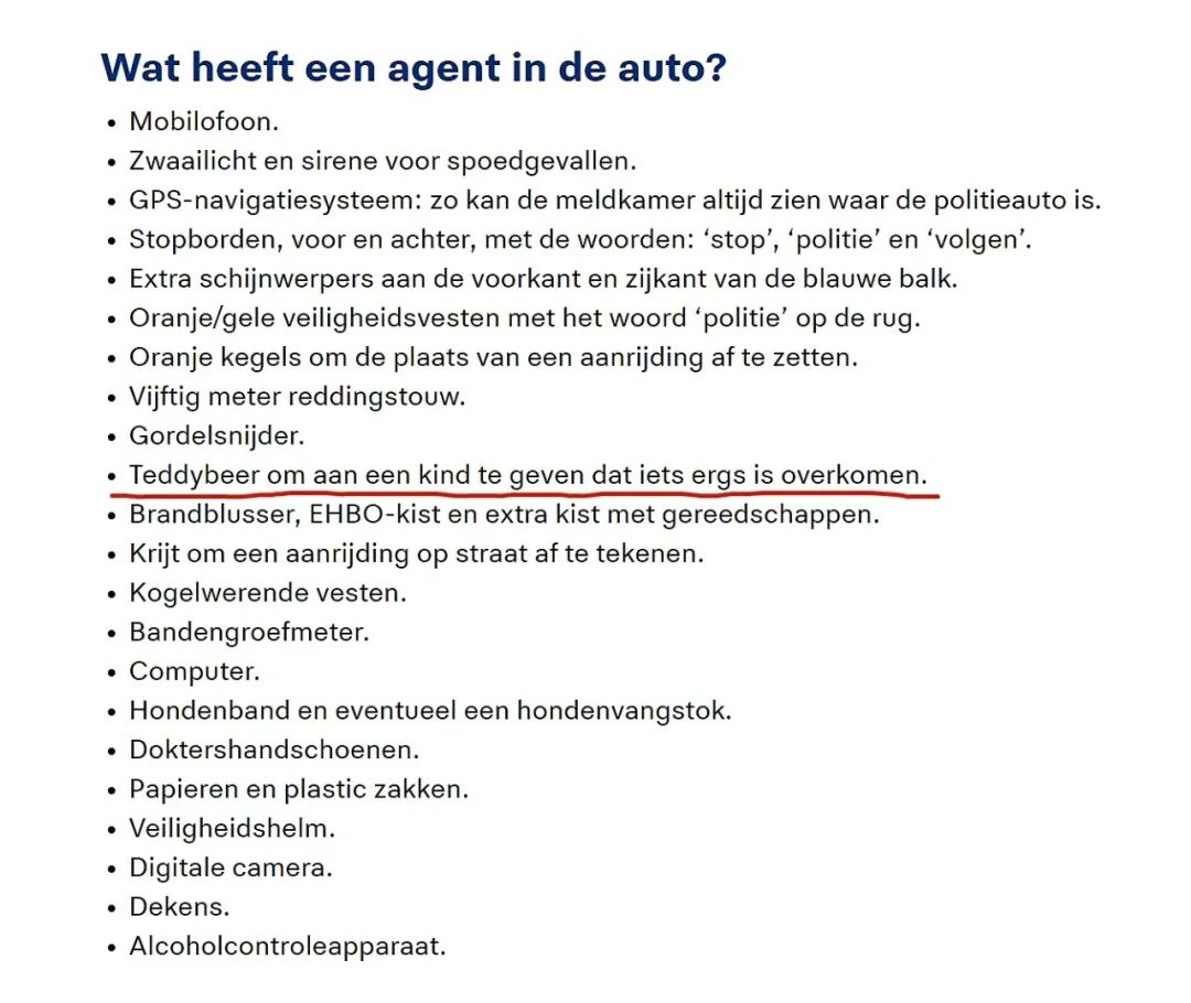 泰迪熊作为荷兰警方应急响应工具包的一部分,赫然与警报器、GPS、灭火器、切割机、防弹背心、酒精控制装置等装备并列显示。