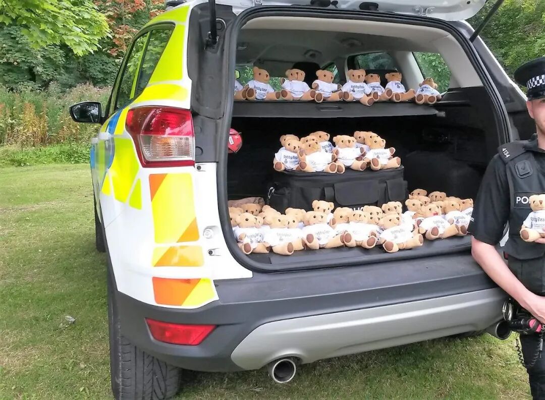 泰迪熊和巡逻车上的其他工具摆放在一起,可爱的形象和其他规范的警械形成了鲜明的对比。