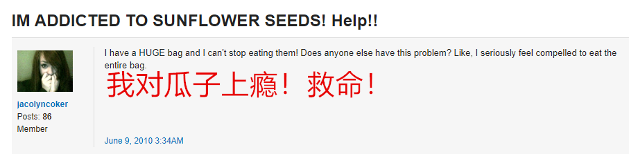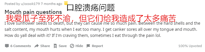 谁能想到在我国属于休闲食品的瓜子却能把人磕进去。Reddit和 MyFitnessPal论坛里瘾君子抱团取暖,欲罢不能。