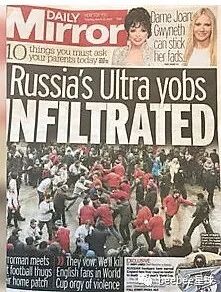 英国《每日镜报》的一篇头条文章声称,这是在特殊节日中以暴力行动展示俄罗斯足球流氓的威慑。