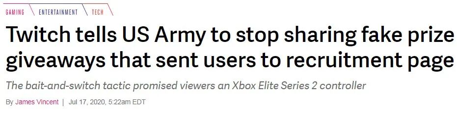上个月,美国最大直播平台特维奇宣布暂停美军电竞队直播间的部分权限,包括抽奖,收礼物等。