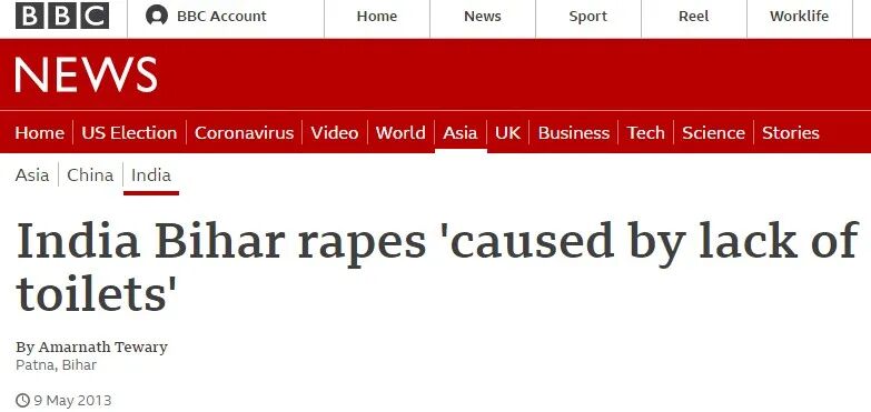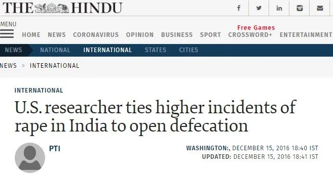 《The Hindu》新闻标题:美国研究员将强*率与露天厕所联系在了一起