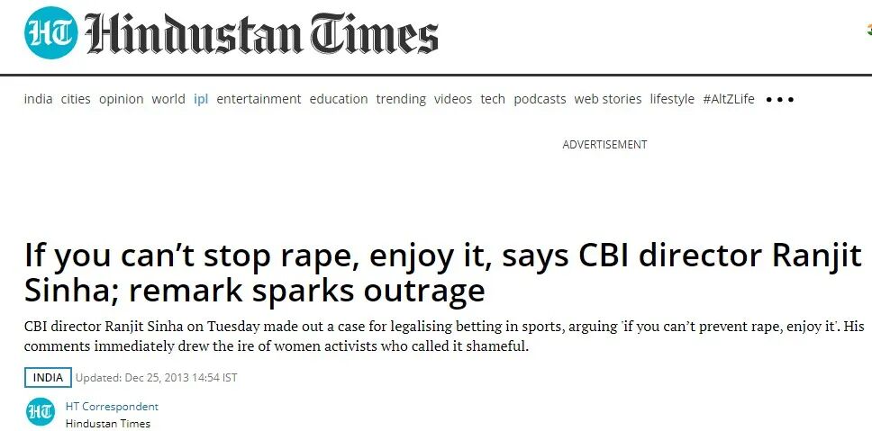 2013年,印度中央调查局局长ranjit sinha面对强*率居高不下时,曾在媒体上公开发表讲话称“如果反抗不了就试着享受”。
