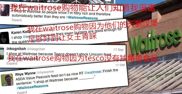 2012年,Waitrose在推特搞过一次营销活动,让用户写下喜爱waitrose的原因,岂料不少消费者口出狂言,由此引发了一场互联网狂欢。