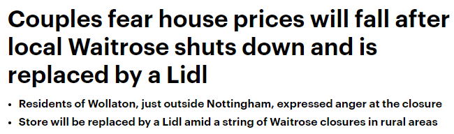 去年诺丁汉郊外的沃尔拉顿的waitrose关闭,折扣超市Lidi取而代之,引发当地贵族集体抨击。