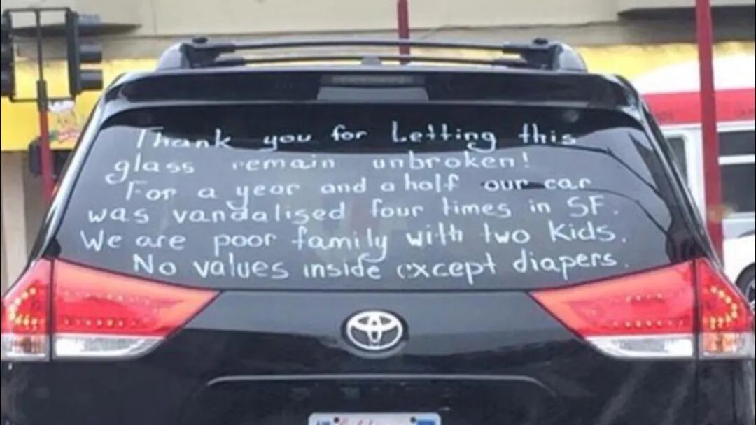 “谢谢你让这个玻璃保持了一年半不碎!我的车在旧金山被砸碎了四次,我们是一个贫穷的家庭,有两个孩子,里面除了尿布没有其他东西。”