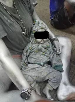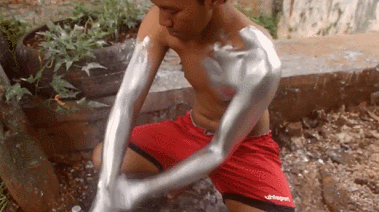 在当地,一桶带重金属的普通油漆大约10万可以买到一桶,差不多是乞讨一天的收入。根据身材差异,掺水后可供全身涂装3到5次。
