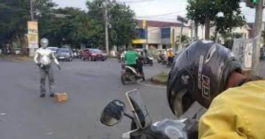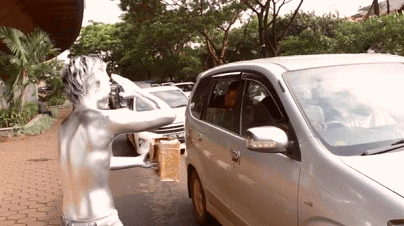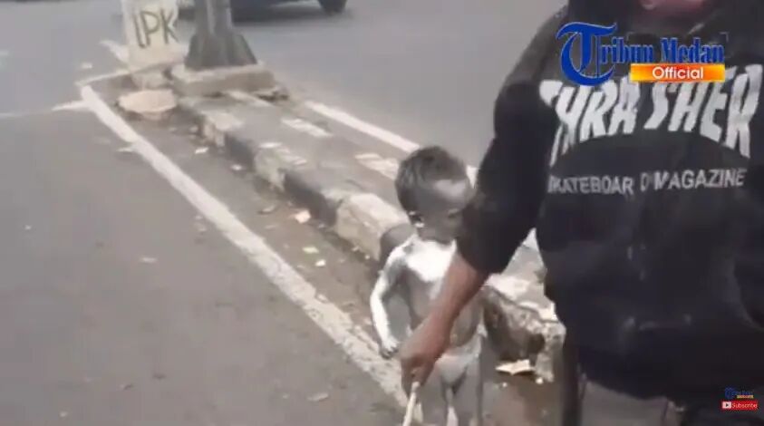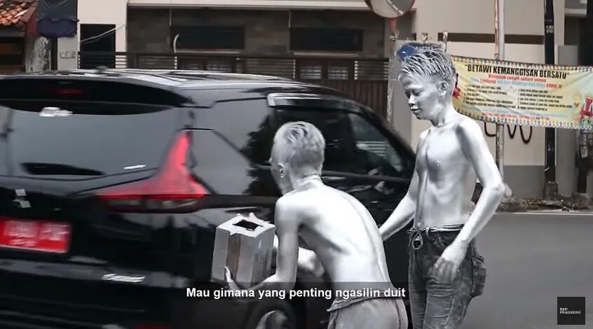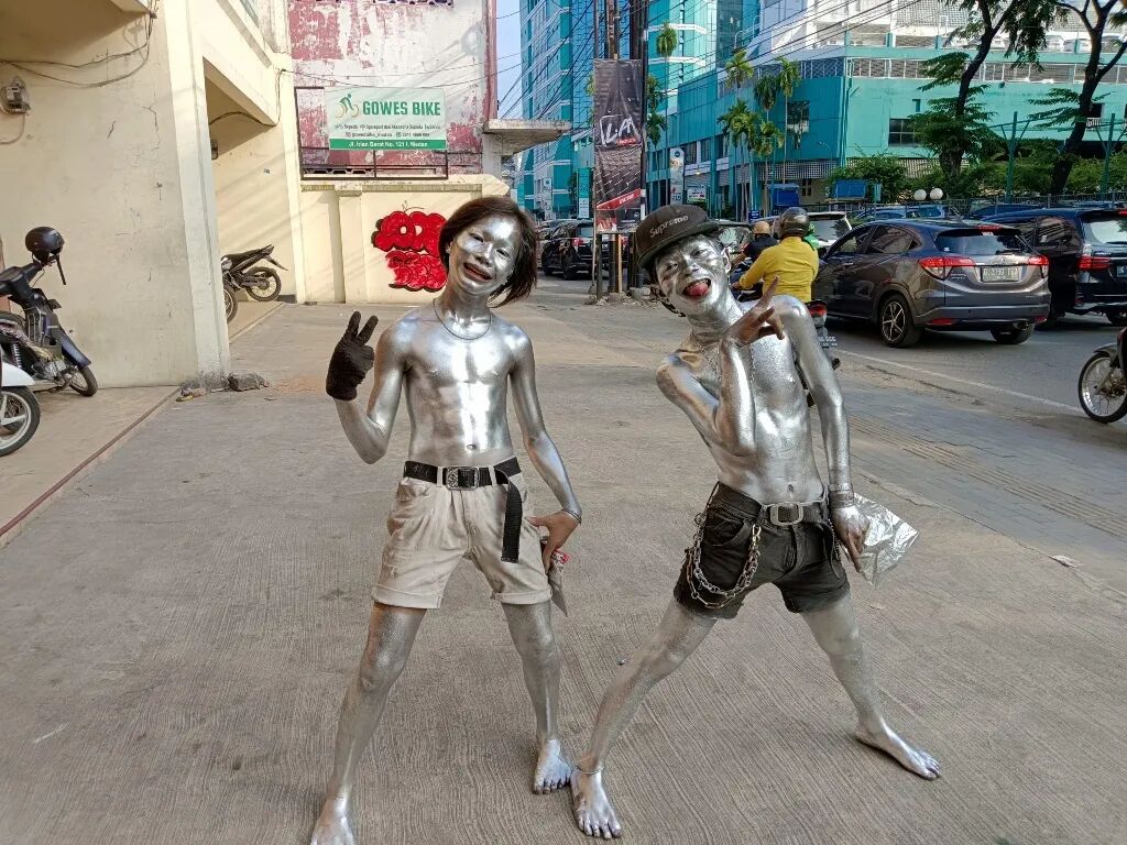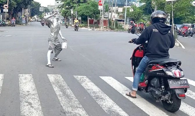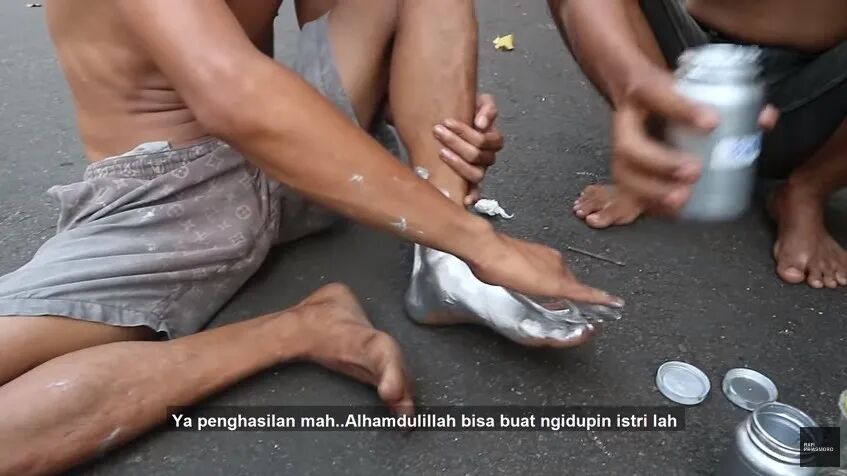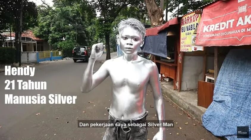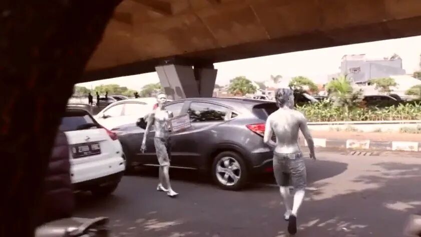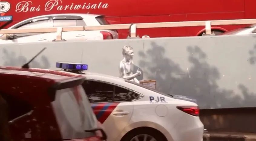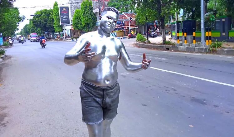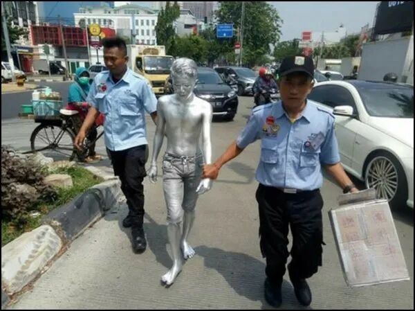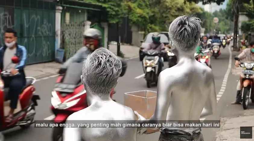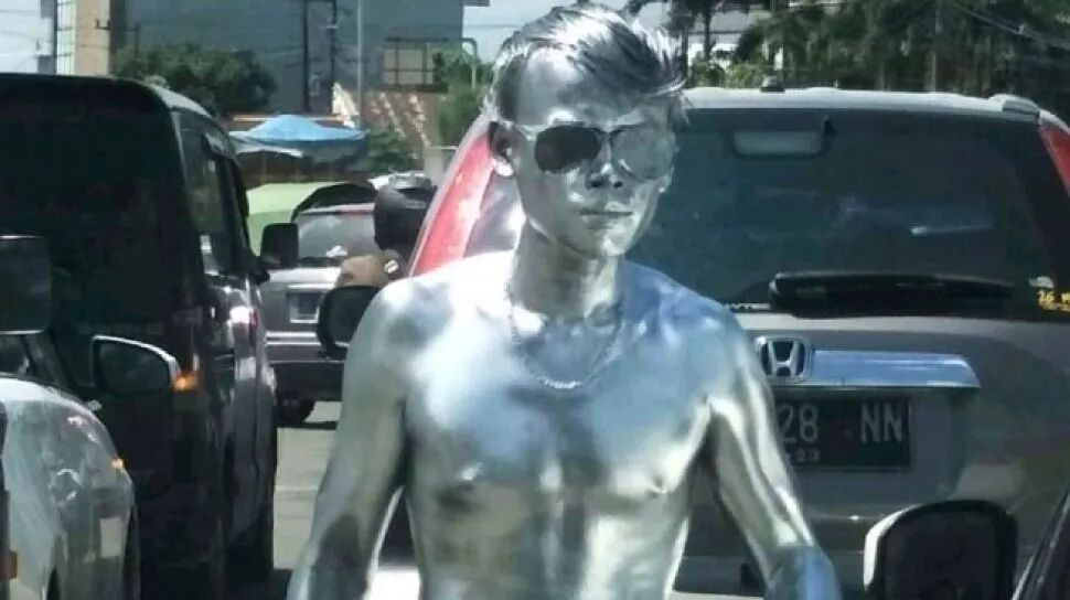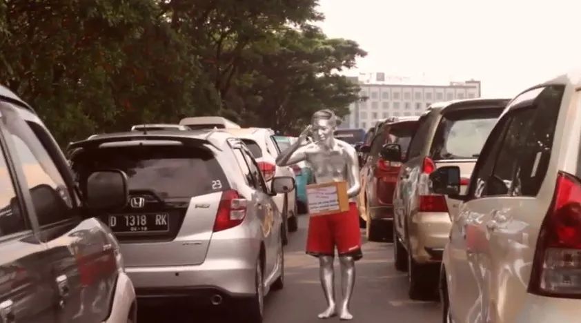 据印尼新闻报道,近年,一种用油漆将身体涂抹成银色,穿行在车流中进行乞讨的现象,正四处扩散,全面开花。