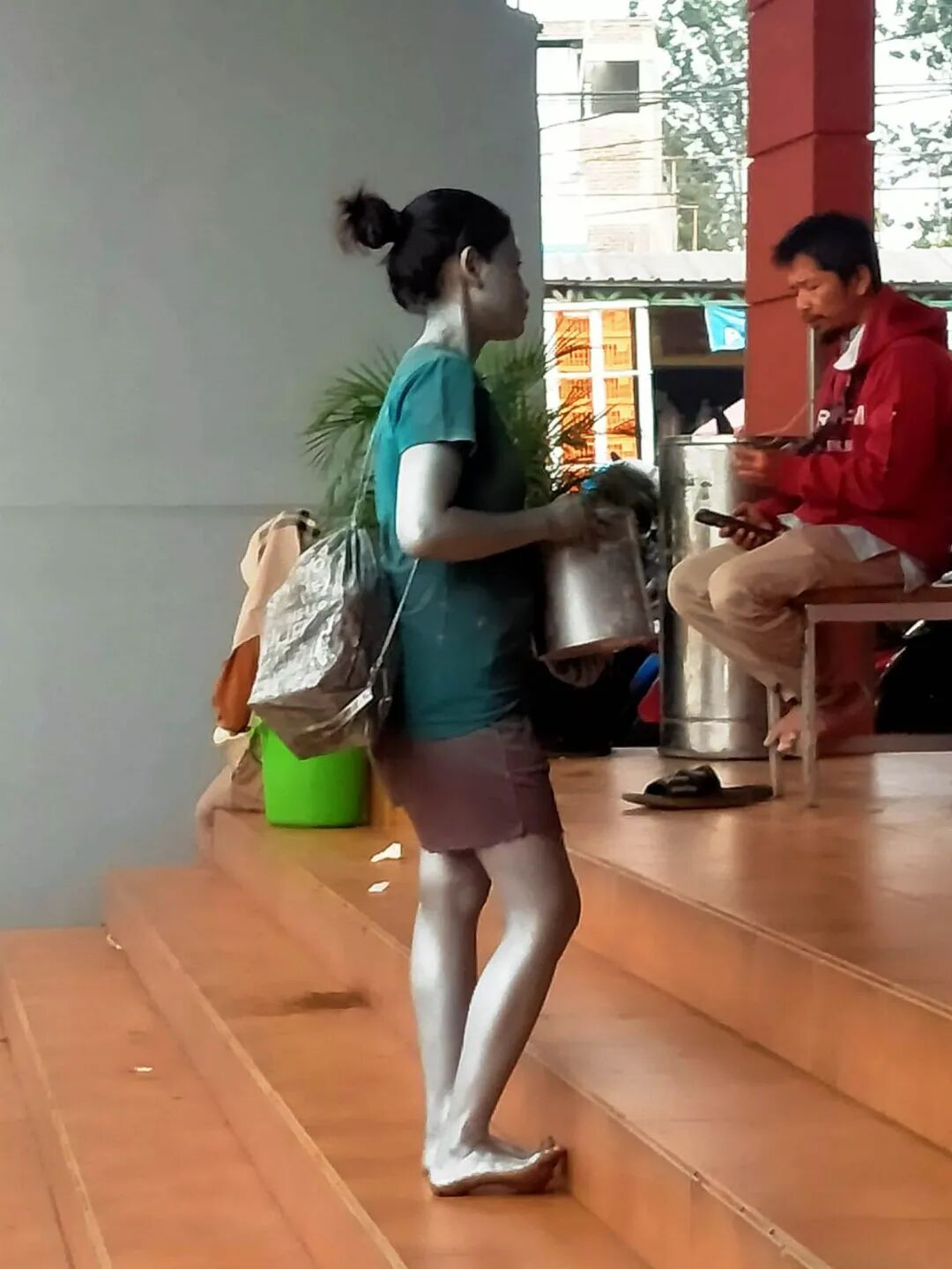 用银色油漆将全身涂抹,再去街上找开车的乞讨就是他的工作。