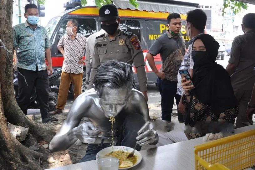 不同于传统乞讨圈,在印尼,扮作银魔乞讨是一种全新的方式,其灵感脱胎于街头卖艺的银人。该项目几年前曾一度风靡印尼各大商圈,获得了不少商演与流量。