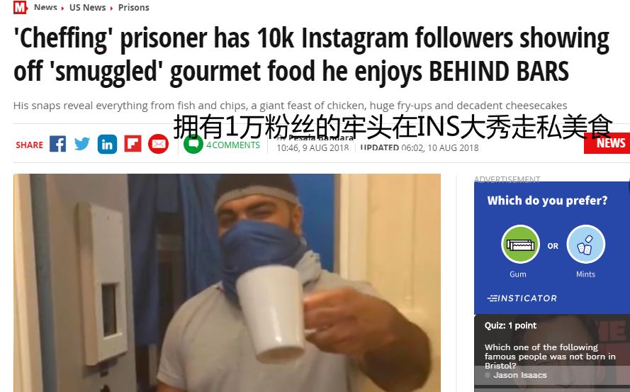 有美媒曾报道,美国监狱走私物品中成人文学、毒品以及蛋白粉位列前三名。