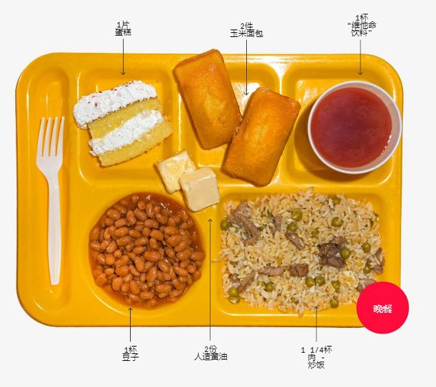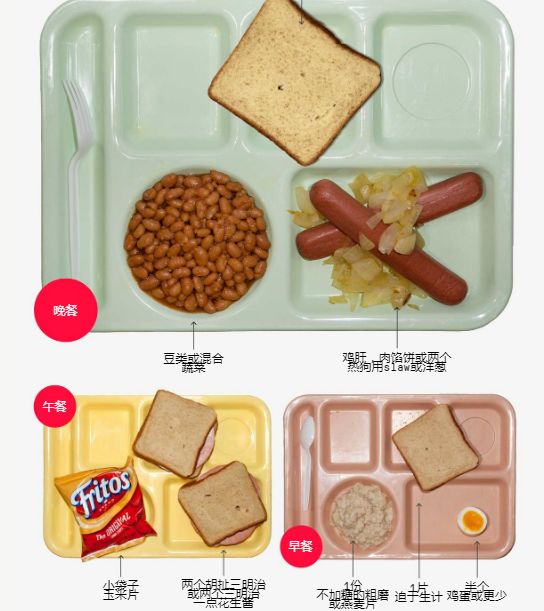 可以看到虽然配餐有按照人体每天正常所需卡路里均衡配比,但分量让人揪心,且有些地方一天只有两餐。