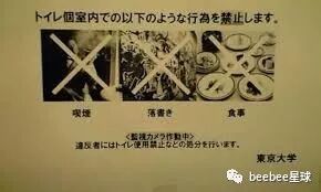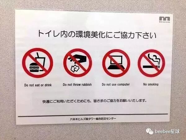 并且在许多公厕内也张贴着这样的告示。除了“不许饮食”之外,“不许使用电脑”也反应出了霓虹国的人民对厕所环境的喜爱与留恋。