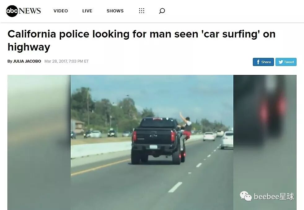 加州警察搜寻在高速公路上“汽车冲浪”的男子
