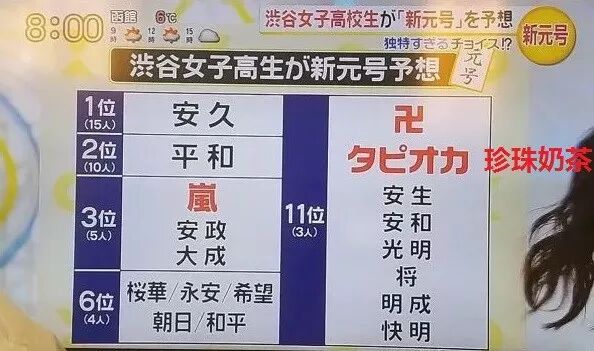 在早先NHK的报道中,涉谷辣妹就对新年号设想交出答卷,珍珠奶茶和少女偶像ARASHI在榜单共存。
