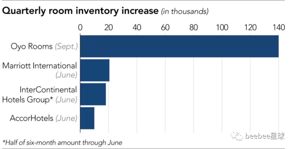 飞速的扩张势头惊动了全球酒店行业。截止去年9月,oyo在全球已有大约140,000个房间,远远超过了全球最大的酒店运营商万豪集团。