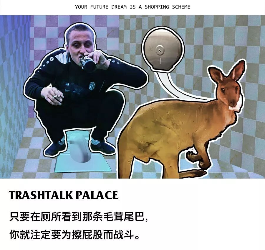 几只袋鼠叼着厕纸从他面前逃走,厕所里散落一地破碎纸片。而一只胆大的袋鼠仍留在原地,像吃海苔一样吃厕纸。