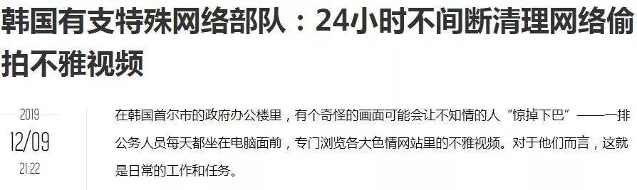 而今年10月,应韩国放送通信审议委员会(KCSC)要求,韩国政府甚至成立了一支“特种鉴黄师”,只负责调查并删除网站上的偷拍类视频。
