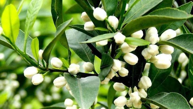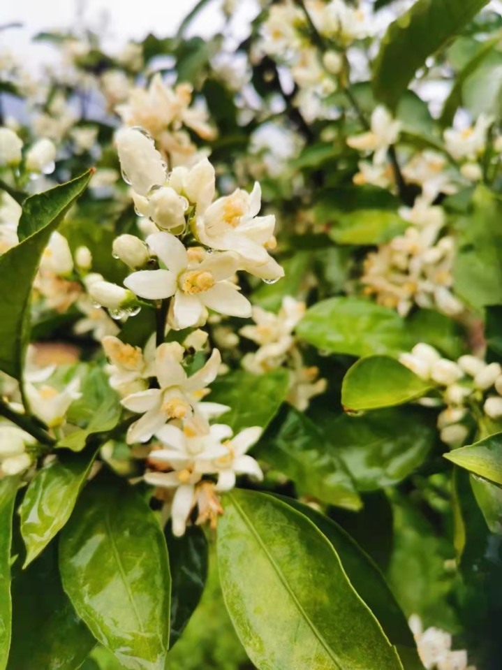 柑橘花枝头拥簇,朵朵花苞纵情绽放,洁白的橘花挂满枝头。枝叶和花朵上挂满水珠,雨后的橘花显得格外的清新迷人。