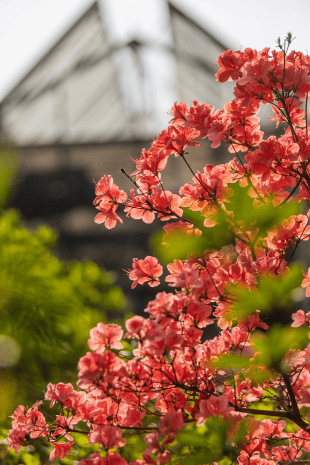 武汉植物园按照一园多线的布局来打造杜鹃景观。杜鹃园模拟野生杜鹃生境,依据坡地落差分类种植亚高山类杜鹃,还原亚高山杜鹃层林红遍繁花似锦的景况,为杜鹃主要观赏区。此时,大片大片的杜鹃灿然开放、映山红遍,浪漫直击心田。