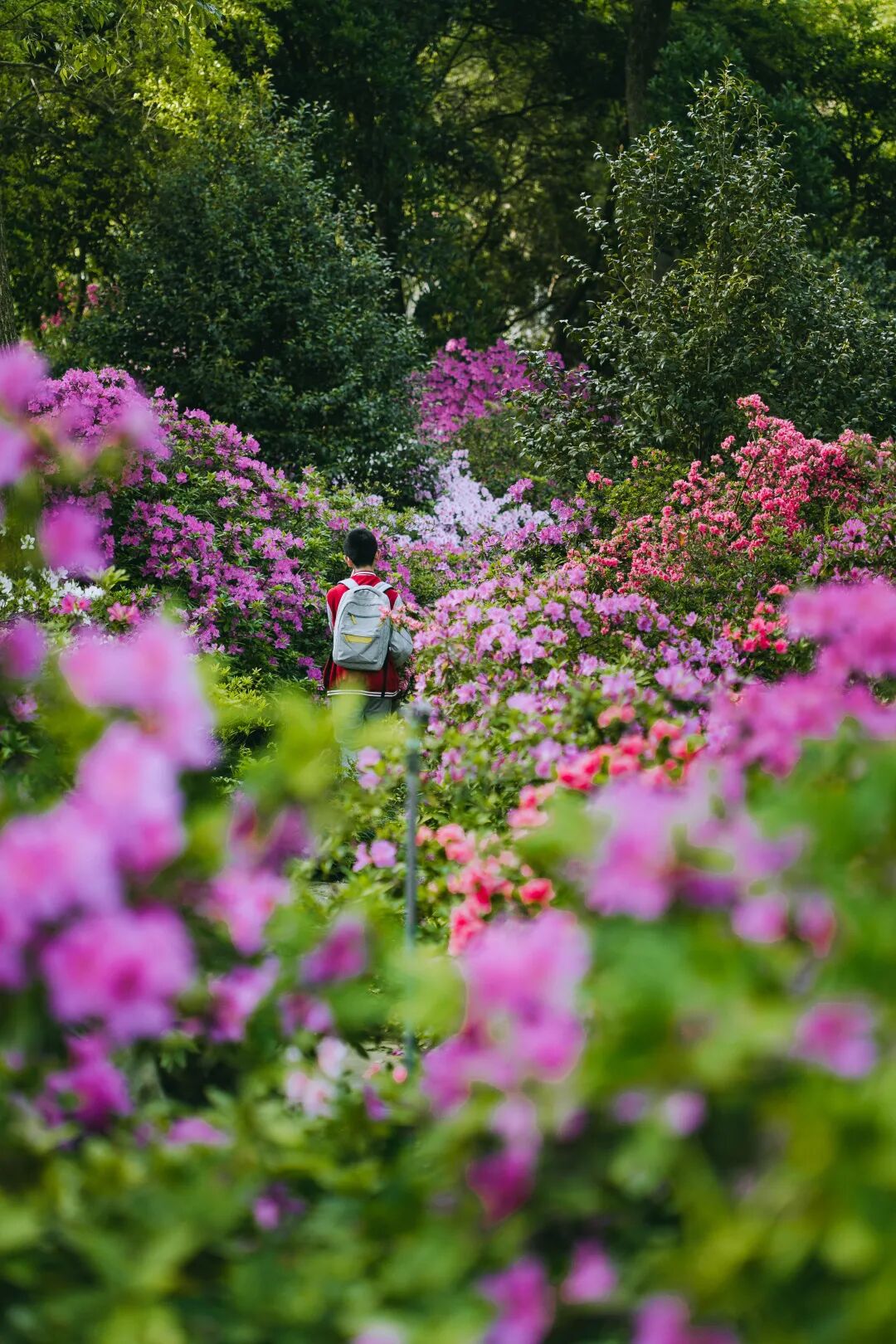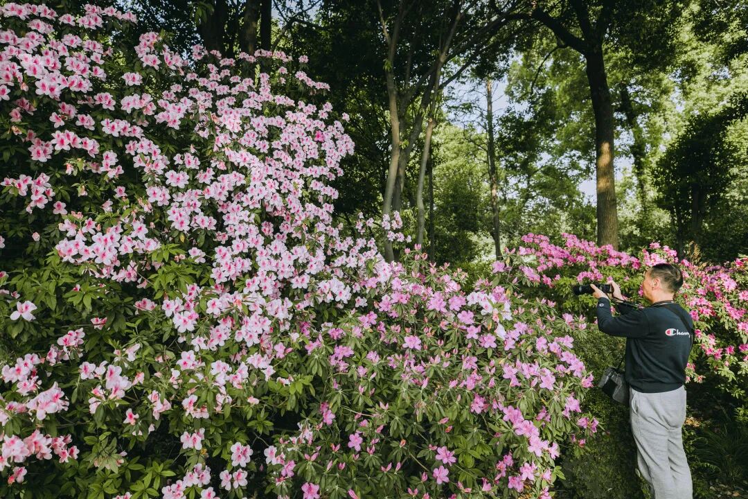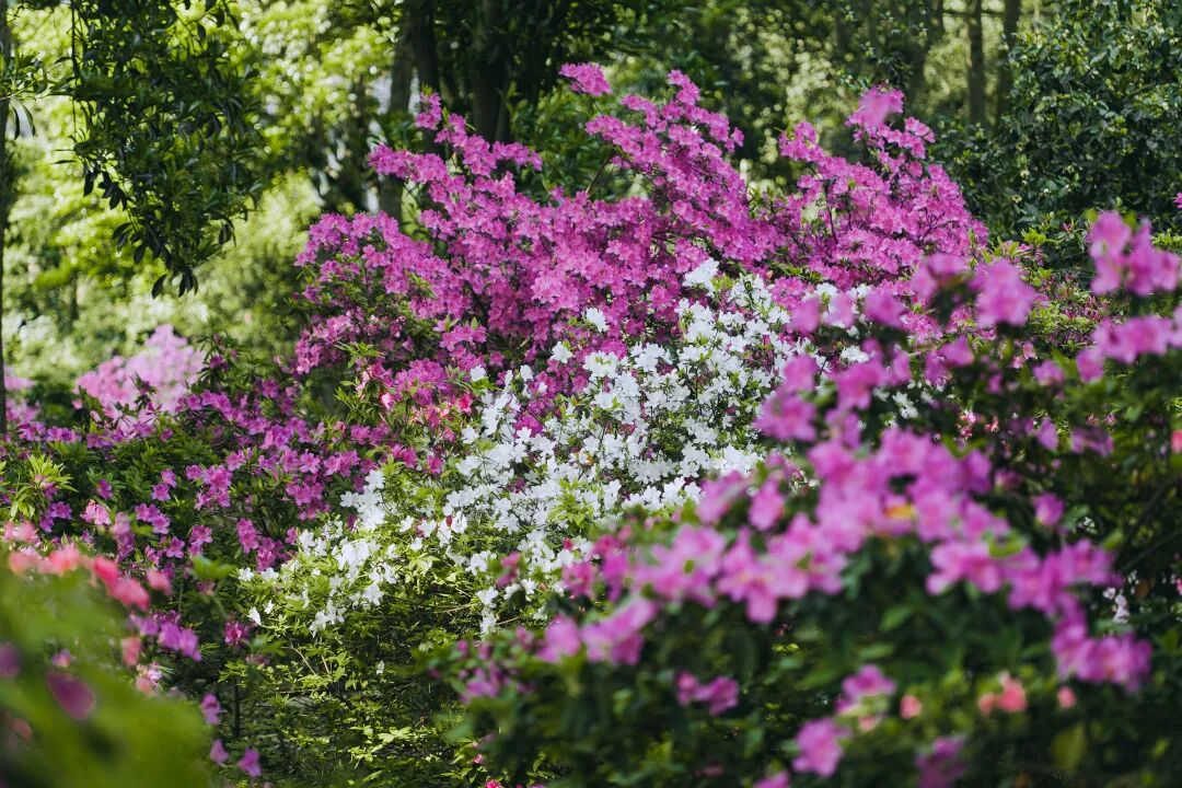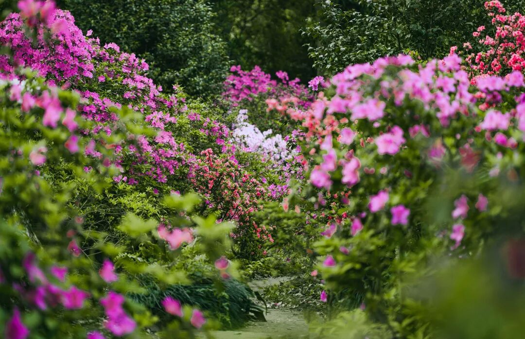走进杜鹃园,一团团一簇簇的杜鹃沿着小径逶迤绵延,指引人走进繁花深处。蜿蜒的小径边各色杜鹃次第开放,转角总能遇到不一样的惊喜。一些高大的乔木在为杜鹃遮蔽骄阳的同时,也带来了密林掩映的美感。