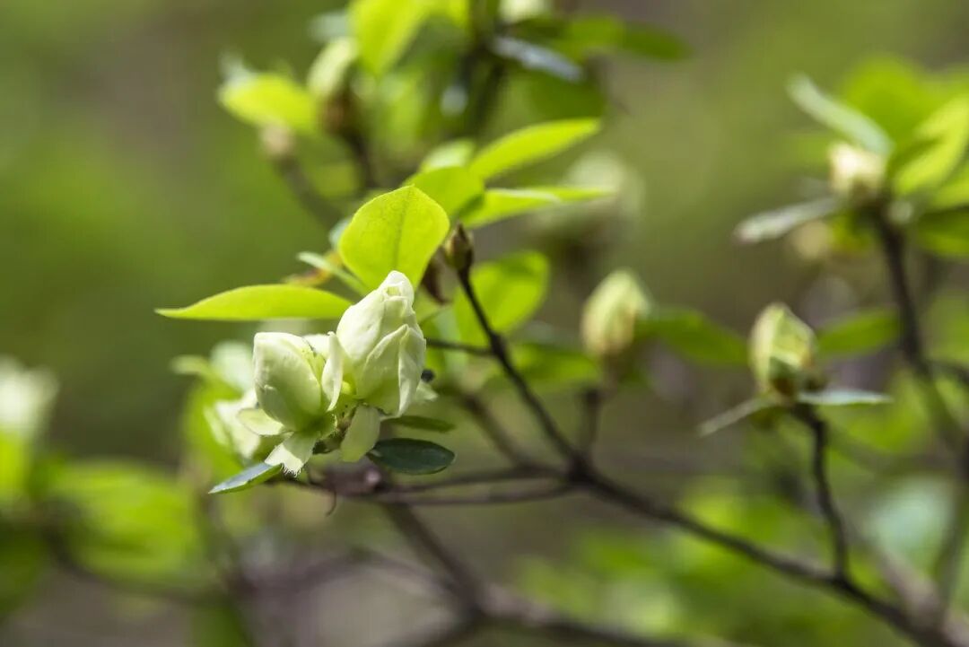 不全是热烈壮丽,绿色杜鹃和白色杜鹃的出现让杜鹃显得“淡妆浓抹总相宜”。绿色的西鹃‘绿色光辉’,气质清雅,浅绿色的花朵在绿莹莹的叶片中显得独特而低调。几种白色杜鹃,花朵硕大但质地轻盈灵动,以清新脱俗的姿态与明艳动人的红粉色系杜鹃争辉。
