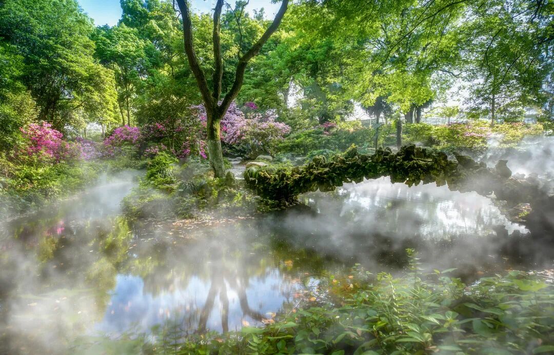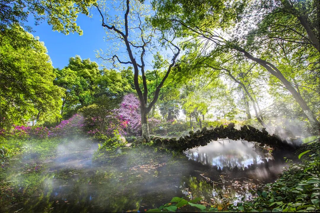 杜鹃园与阴生植物区交界处的杜鹃迷雾景观是最受欢迎的风景。幽静密林中繁花锦绣、流水潺潺、石桥嶙峋,迷蒙的雾气穿梭缭绕,绯红的杜鹃在一片氤氲中若隐若现。迷雾罩林涧、繁花隐雾中,如人间仙境。