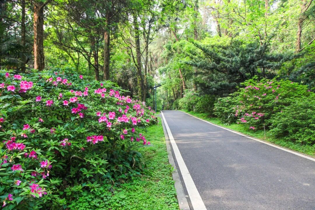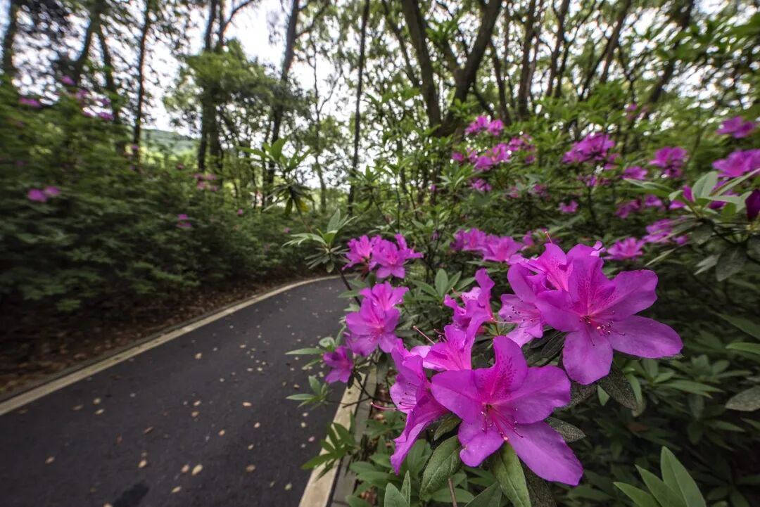 园里的多处杜鹃小径也不要错过。杜鹃园-药园-山茶园-猕猴桃园-三峡消涨带沿线的道路两旁通过丛植、片植等方式打造姹紫嫣红的杜鹃花带,一簇簇一条条的杜鹃花蔓延铺陈开去,揽花如怀,让人仿佛遁入画中。两侧杜鹃夹道欢迎、触手可及,手机拿起,相册尽被一抹抹动人的深紫、浅粉所占据。