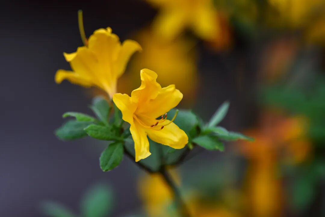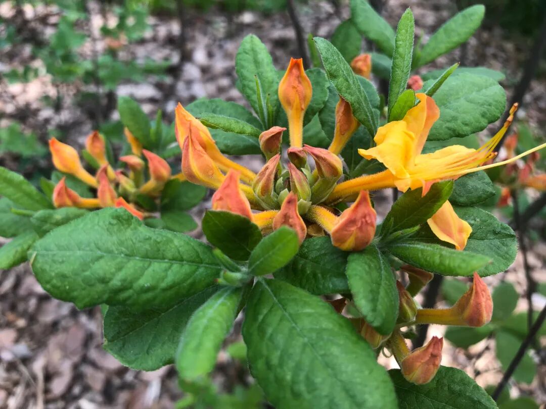 橙黄色的杜鹃是小众尖货,小而美好,需要你耐心才能发现。佛罗里达杜鹃在初花时还是绿色中夹杂着少许橙色,开花后,花瓣完全变成了橙色,像一顶炫目的王冠。黄色的羊踯躅,它花开夺目、颜色鲜艳,虽具有较高的中草药价值,但是著名的有毒植物之一,因羊食时往往踯躅而死,故此得名。