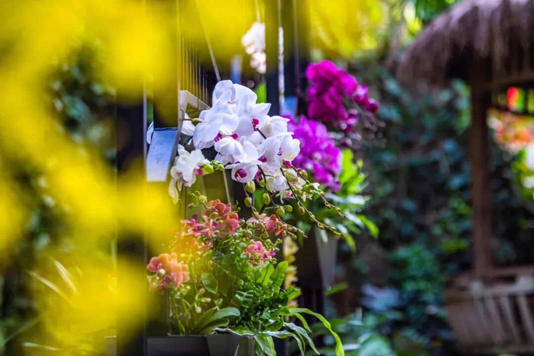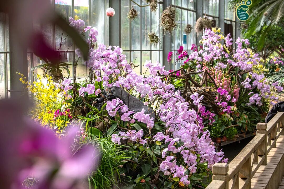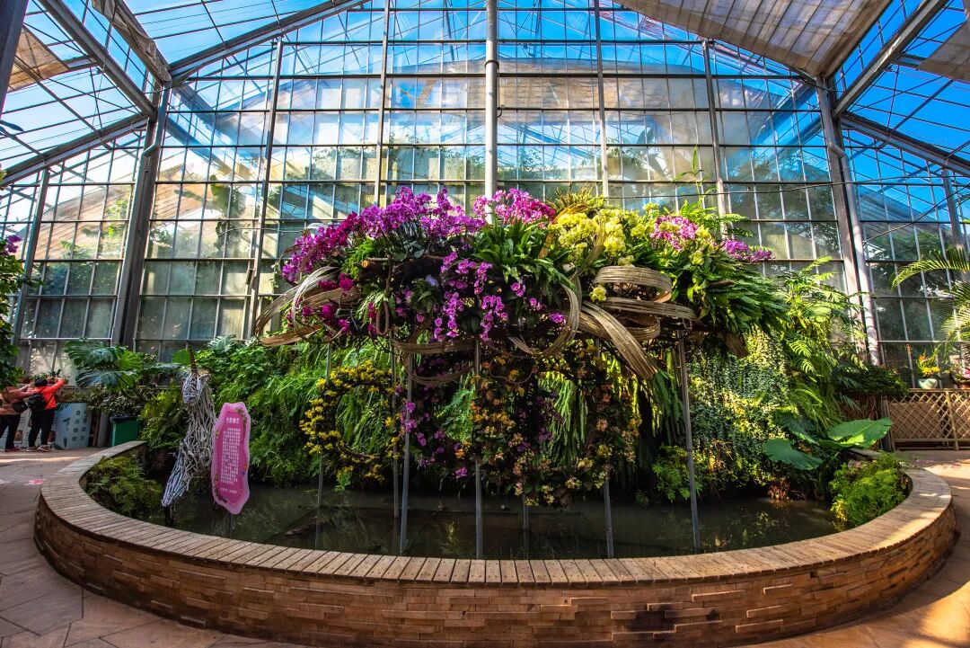 ⼀簇簇蝴蝶兰在⼭⽔廊桥中肆意⽣⻓,形态各异,五彩缤纷,两岸连片的绿⾊更衬托出兰花的婀娜形态。