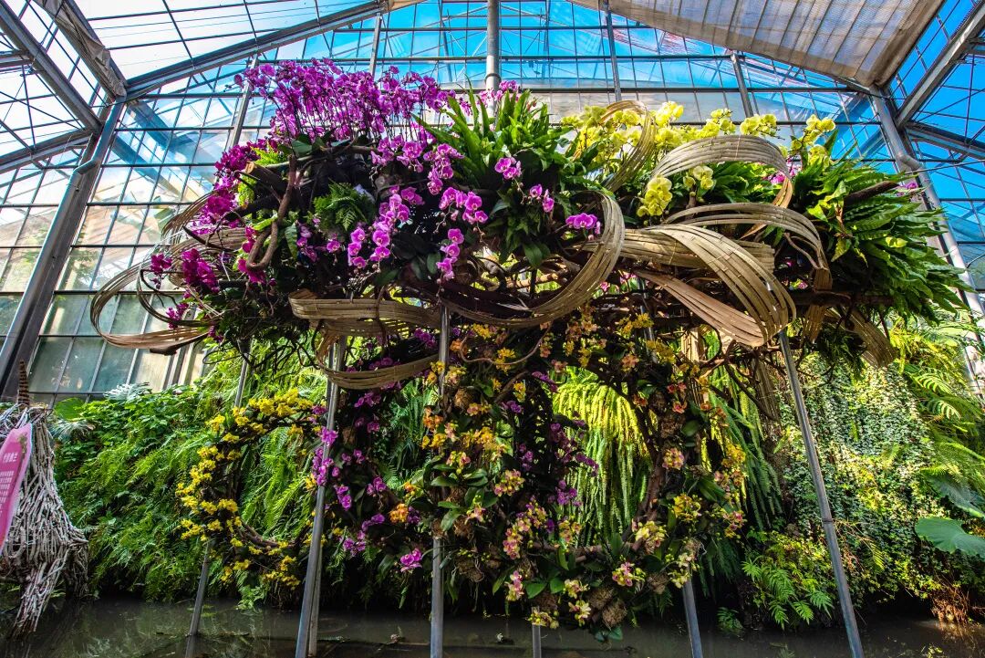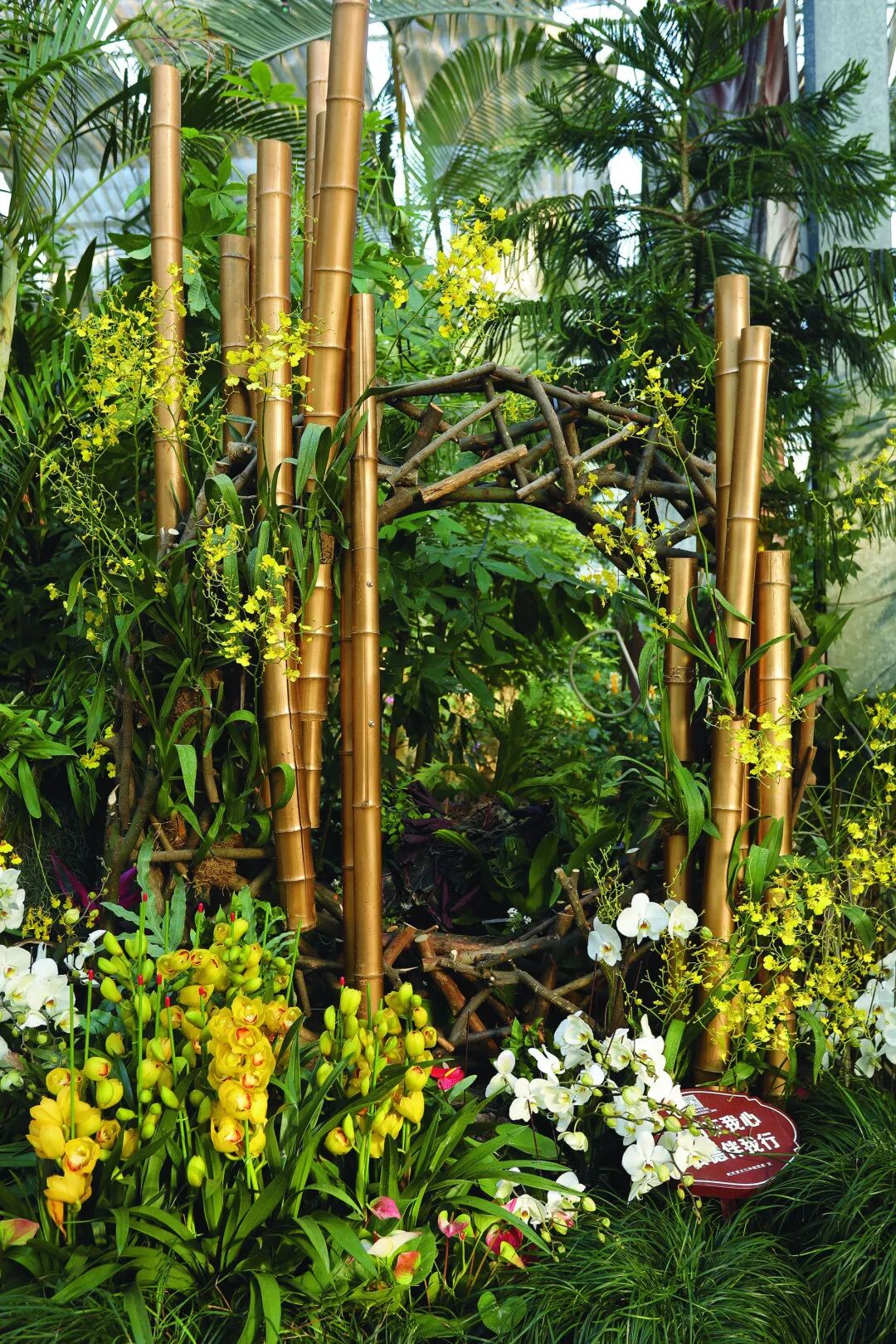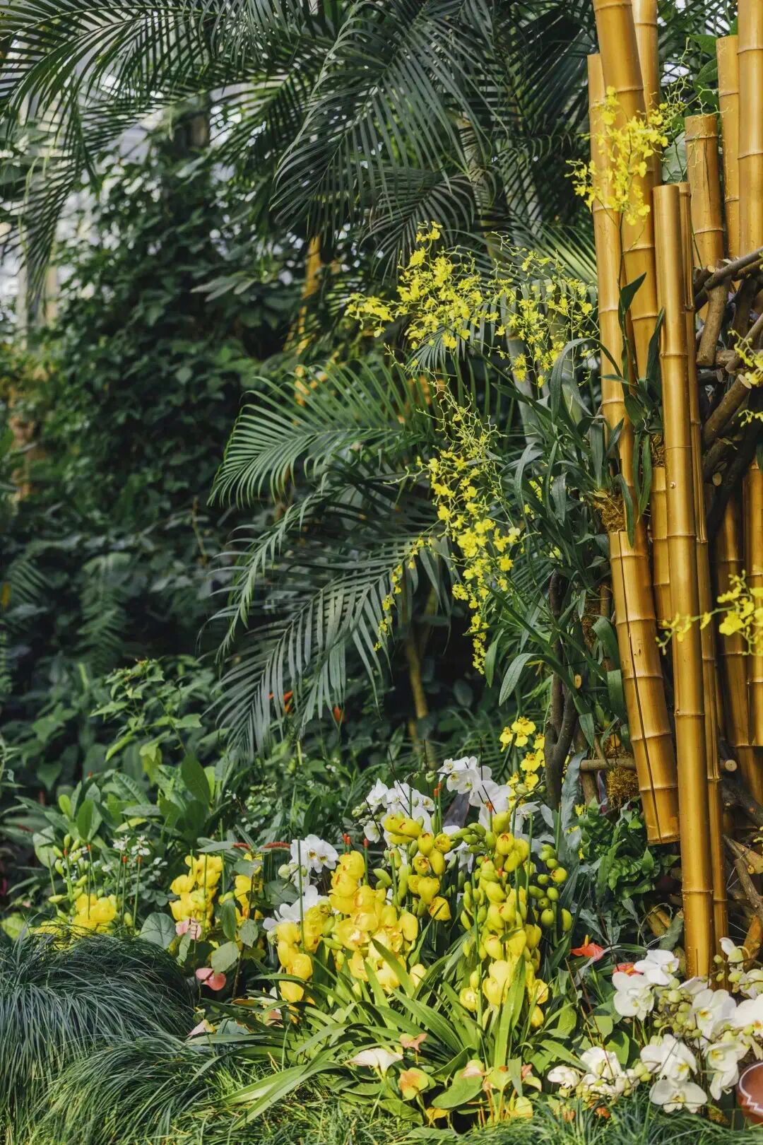 ↑⼗个⽤树枝和各个品种的兰花搭建起来的⻔廊,让⼈仿佛⾛⼊了兰花的森林深处。