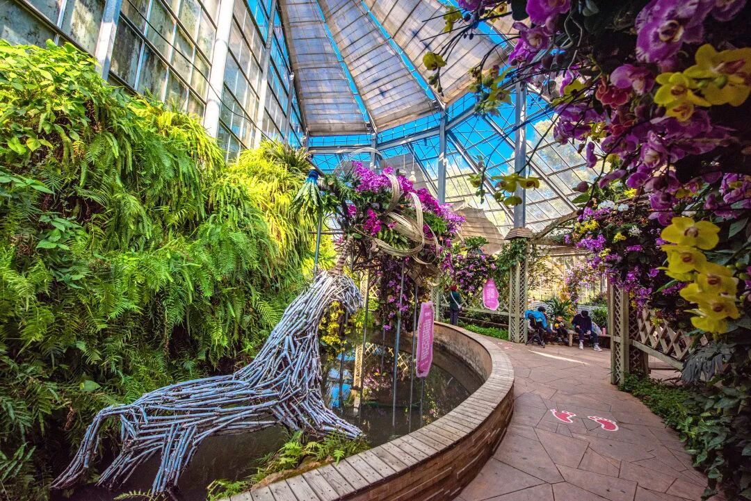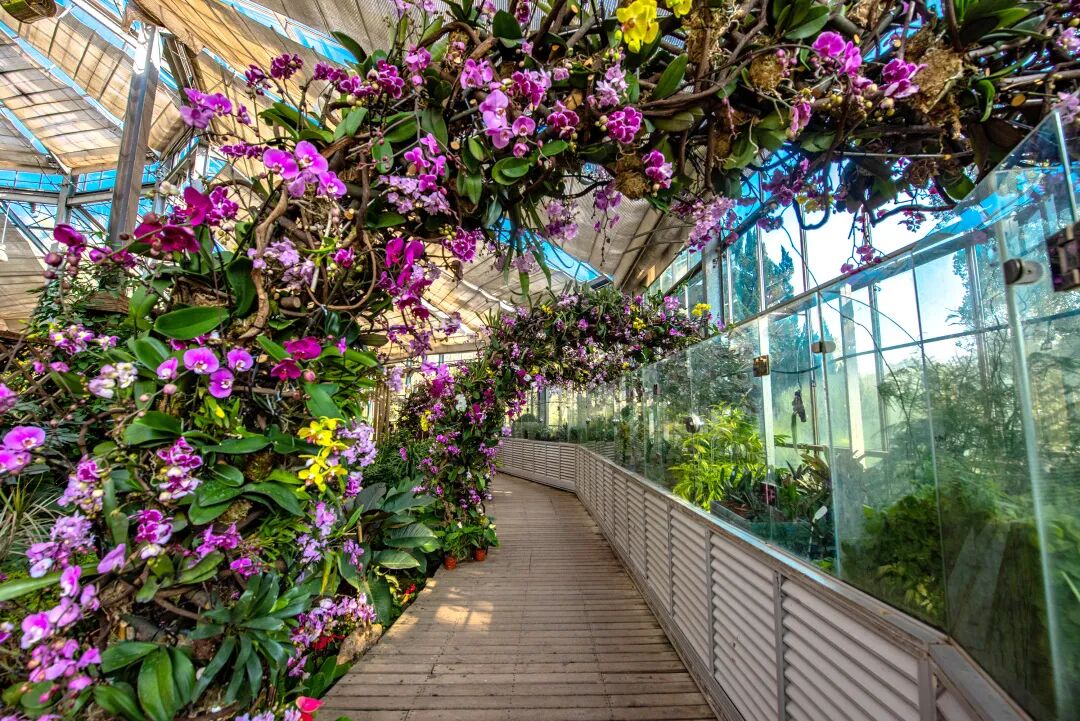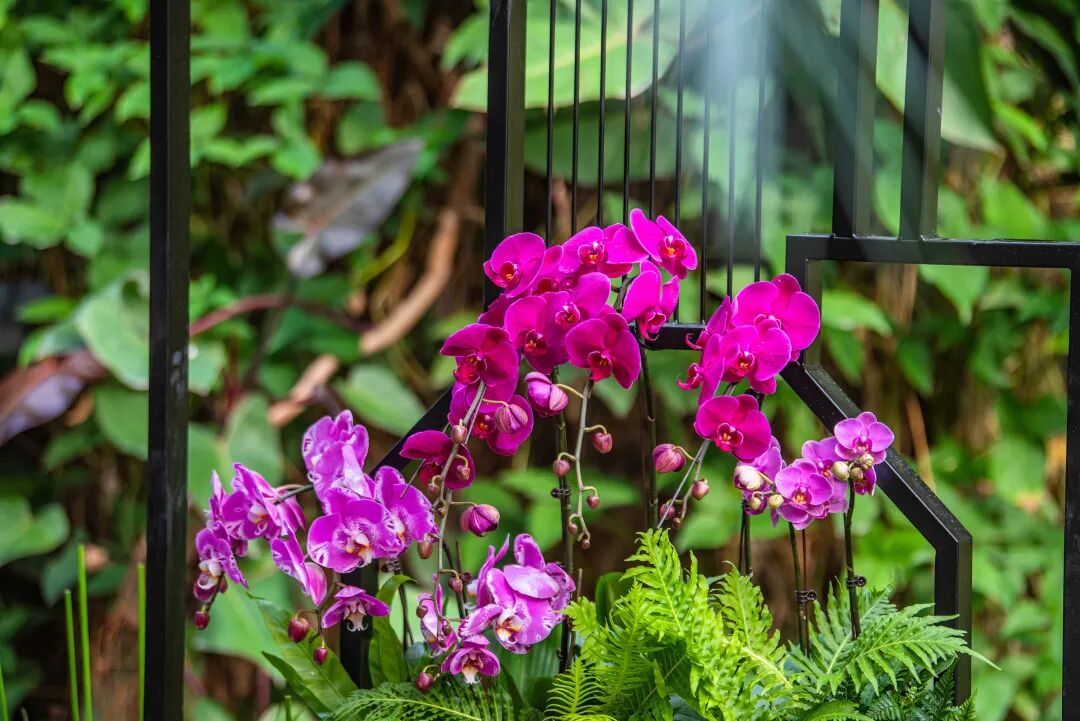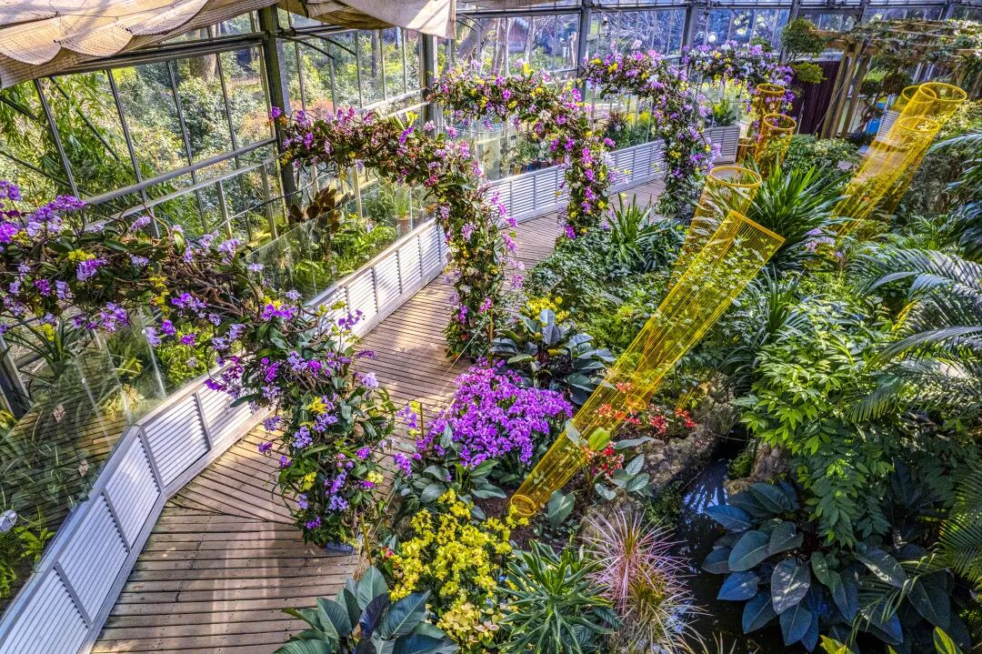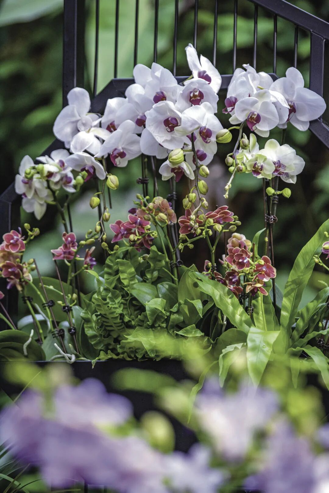 ↑⼗个⽤树枝和各个品种的兰花搭建起来的⻔廊,让⼈仿佛⾛⼊了兰花的森林深处。
