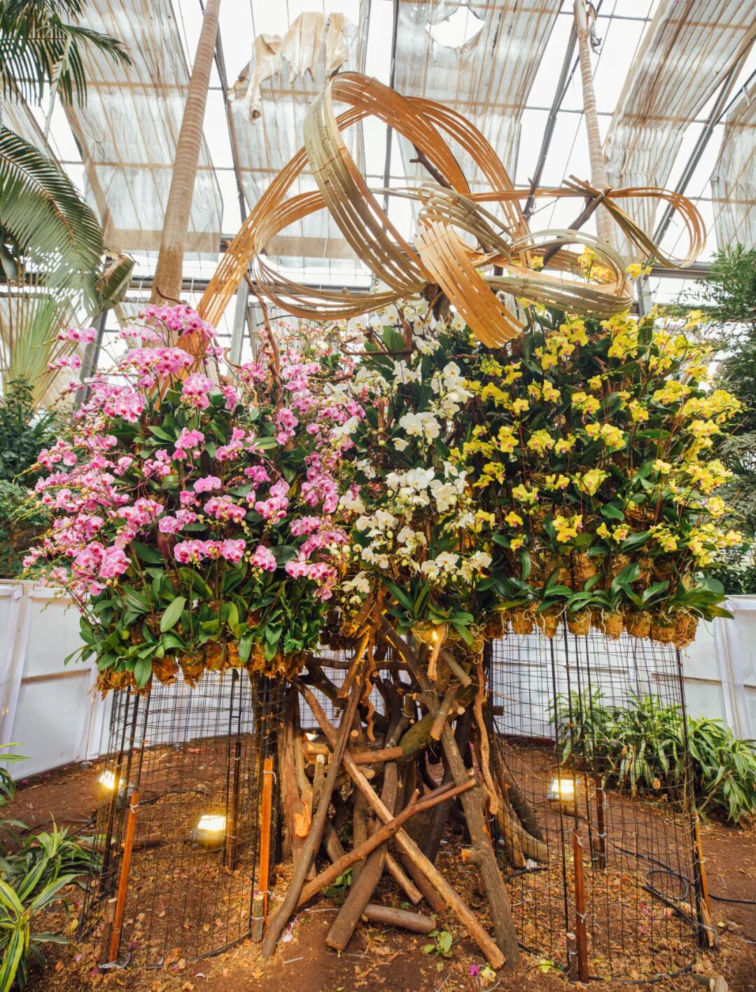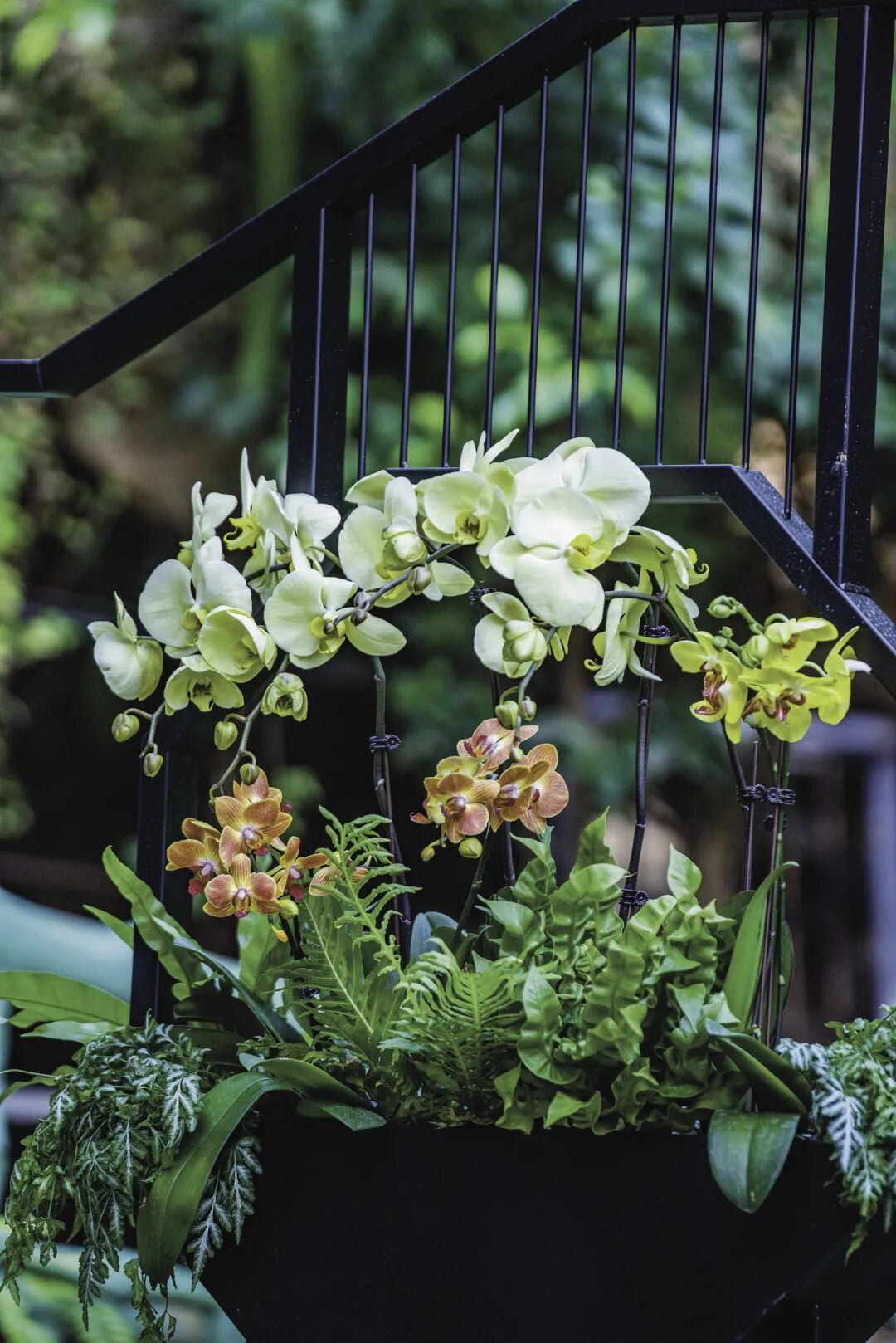↑树枝和枯藤构成了这组巨型蝴蝶兰架构景观的主体,再由⼗余种蝴蝶兰及绿⾊蕨类组成了植物群落,跳跃的⽵篾增加了作品的张⼒和视觉冲击。