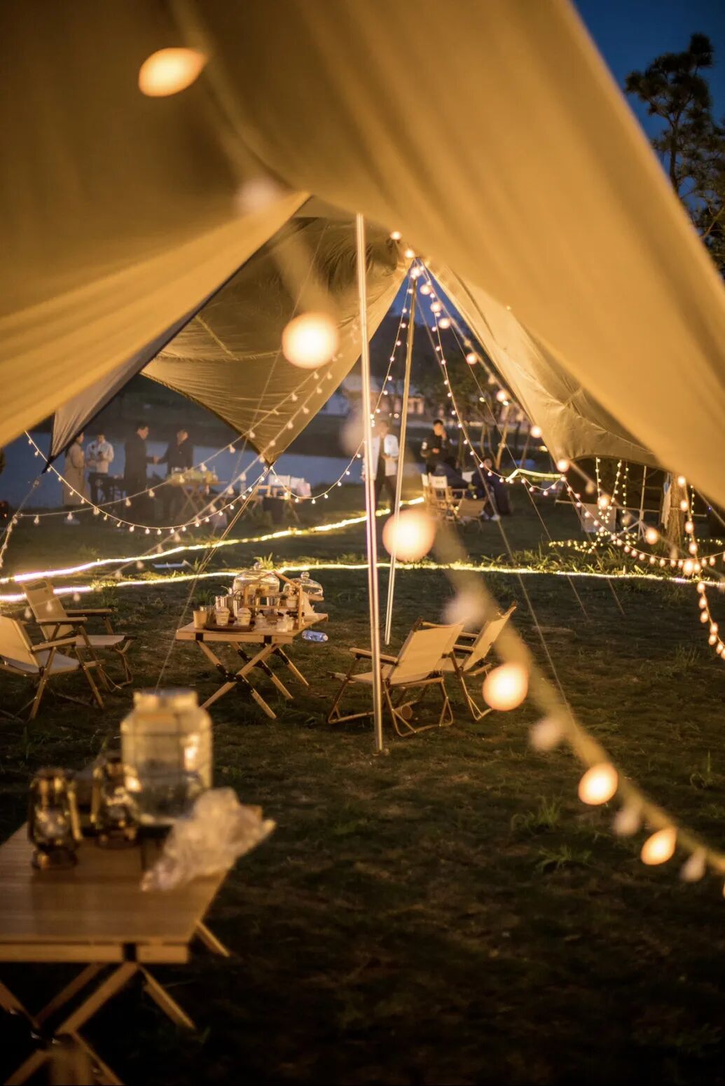 在大草坪上支起一顶帐篷,和TA坐在靠椅上,品点小酒,赏灯观星,美景在前,美食在旁,爱人在侧,时光仿佛都慢了下来,沉醉在这无边的夏夜晚风中。