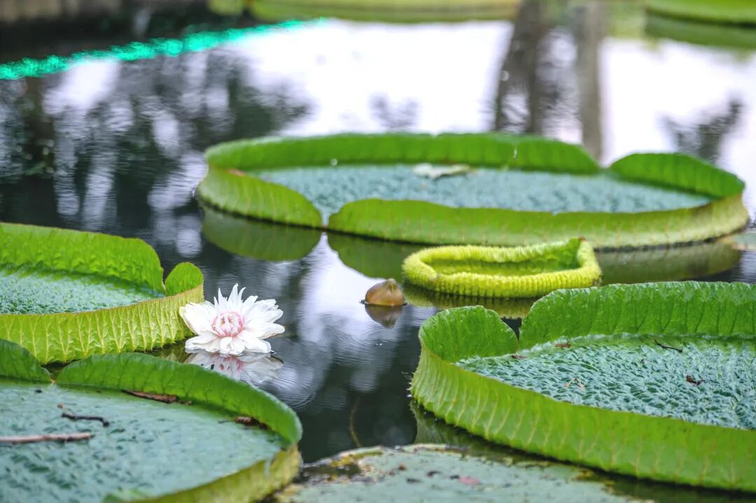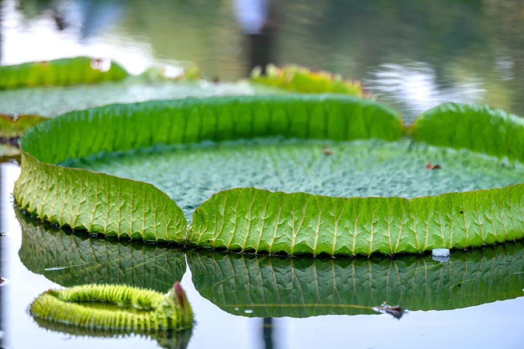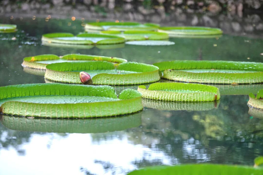 王莲叶片如盘,下雨的时候如何解决叶片排水问题呢?这个水中王者有着自己的小心机:王莲卷曲的叶片边缘长有两个小缺口,它们就像两个巧妙的排水口,可以将雨水轻松排出去。
