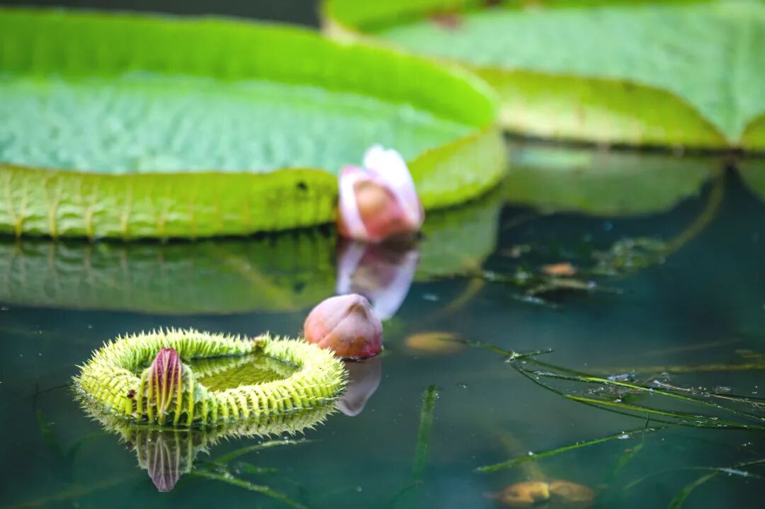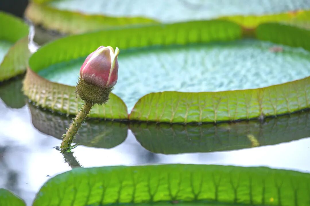 王莲以体型巨大而闻名,它的叶片呈圆形或是椭圆形,叶缘直立上翘,像是一个巨大的圆盘形。一张张巨大的圆盘浮游于水面之上,而王莲花朵便独自屹立于枝叶之中,颇有一种“所谓伊人,在水一方”之境。