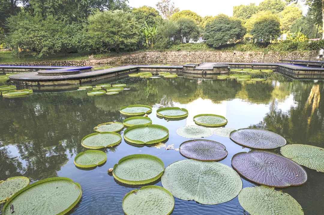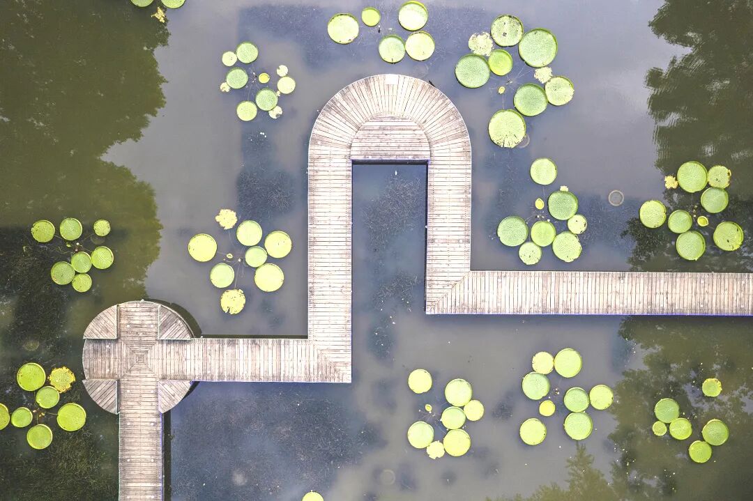 武汉植物园的王莲主要为克鲁兹王莲和长木王莲两种,共有30多株。30多株王莲在水面接连铺开,绿荫如盖,蔚为壮观。从空中俯瞰,一个又一个硕大圆润的叶片似漂浮在水面的圆盘,工整地排列在一起,姿态甚是可爱。